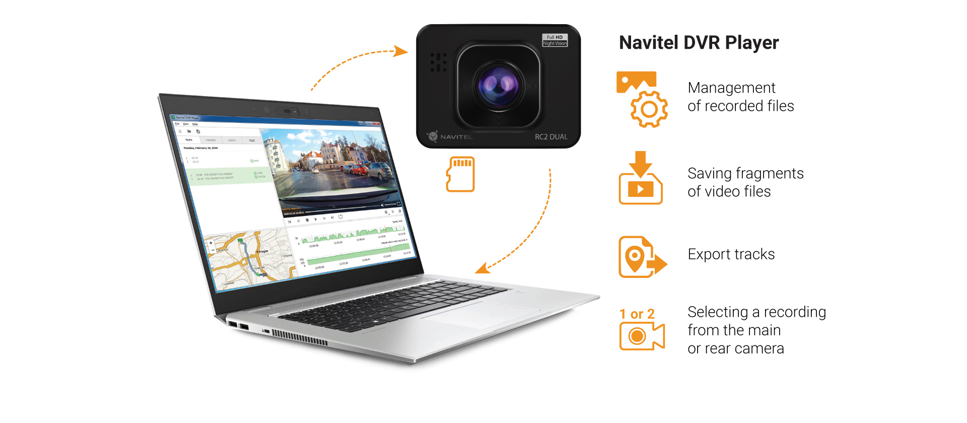 On NAVITEL RC2 DUAL there is the GC2053 (night vision) matrix and the glass lenses and a wide viewing angle of 140°, which provides a high-quality recording of everything that happens on the road.
